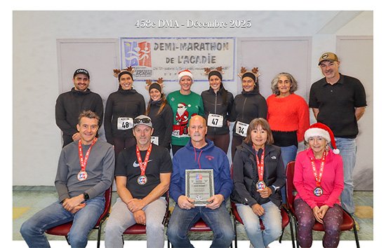 10 Dec 2025 - Le 458e Demi-marathon de l’Acadie célèbre Michel McGraw et remercie ses bénévoles Par Donald WadeVingt et un coureurs, dont neuf femmes, ont pris le départ du 458e Demi-marathon de l’Acadie en ce 7 décembre 2025 sur le nouveau parcours en raison de la fermeture du Pont Snowball de Tracadie. Le vainqueur de la course fut Timmy Basque de Shippagan avec un chrono de 1:35:00. Il fut suivi de Gaétan Chiasson de Caraquet qui a enregistré un temps de 1:37:35. Louis-Philippe McGraw de Tracadie a remporté le bronze en 1:47:25. Chez les dames, Misook Hwang de Miramichi a terminé première en 1:50:10, suivie de Nathalie Boivin de Bathurst en 2:01:10 et de Véronique Haché de Little Bartibog en 2:15:02.